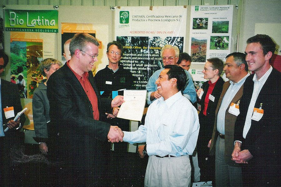 Van der Hoff se conoció en Utrecht , gracias a un amigo común, Nico Roozen , jefe de desarrollo empresarial de la agencia ecuménica de desarrollo Solidaridad, quien inmediatamente se interesó por la actividad de Frans. En asamblea los integrantes de UCIRI decidieron cambiar del cultivo convencional al orgánico. “Un agrónomo alemán que andaba en nuestra zona nos dijo: ¡caray ustedes de hecho ya son orgánicos y con algunas técnicas pueden entrar a un programa! De esta forma, narra Frans, “entramos a la IFOAM (Fedración Internacional de Movimientos de Agricultura Orgánica), fuimos a la primera asamblea en Budapest y aprendimos todo el rollo de lo orgánico. La entidad alemana, Naturland, certificó cada año nuestras parcelas; pero pronto estuvimos hartos de los altos costos, porque tenían que venir de Europa para inspeccionar y certificarnos. Luego formamos Ecomex, antecesor de CERTIMEX”.